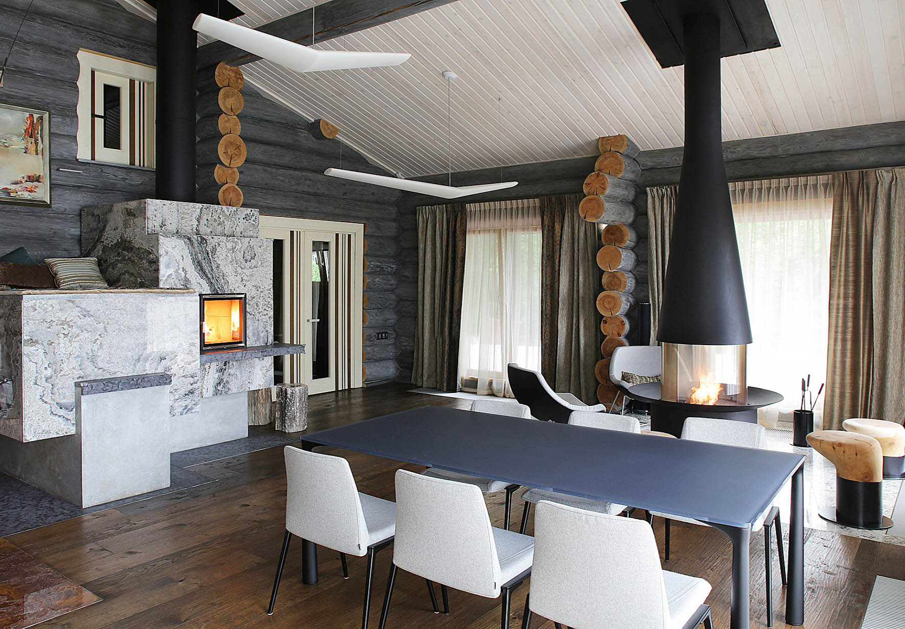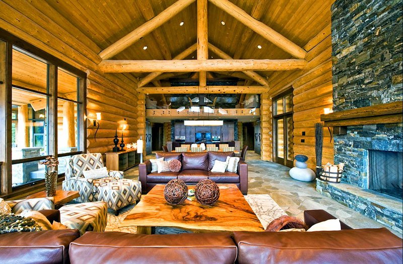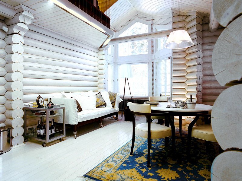 Stylish interior design of the house from round timber