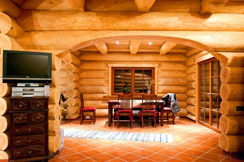 The flooring is covered with a board impregnated with a dark composition. The walls may remain from the bars, but they will have to be saturated with a brown tint of oil. The ceiling space, namely the floor partitions are made of huge logs of trees, roughly polished.