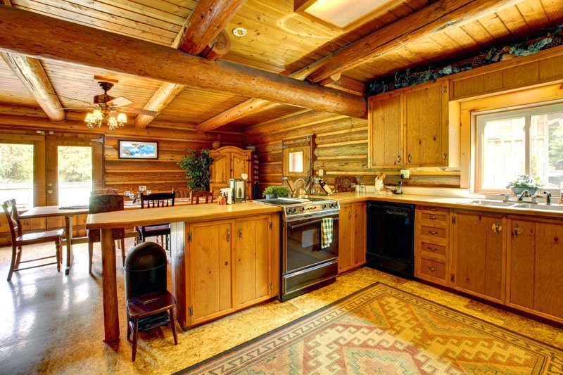 The interior of a wooden house made of timber in the kitchen requires color diversity. As this, an emphasis on the kitchen set is suitable. It is made in light, soft colors. For example, olive or milky white facades of cabinets and shelves.