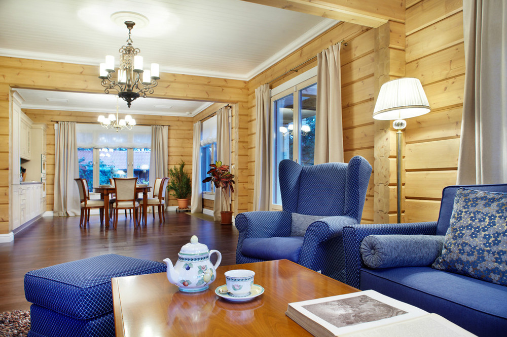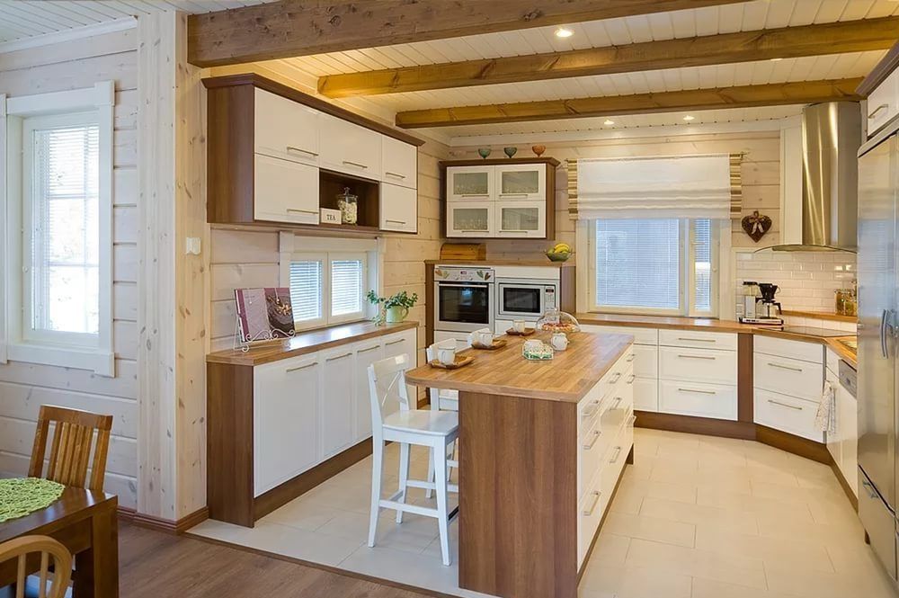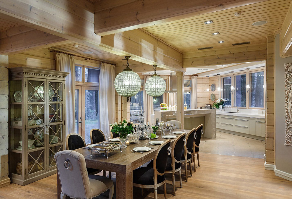 The interior of the house from glued beams looks good in both light and dark versions. French Provence is ideal for the kitchen. The walls are decorated with white matte impregnation, the main element of Provence. Kitchen flooring is best made from moisture resistant material.The tree here will quickly wear out and lose its presentation. Therefore, it is better to use ceramic tiles. It is better to close household appliances with wooden facades. Metal and plastic will be inappropriate here.