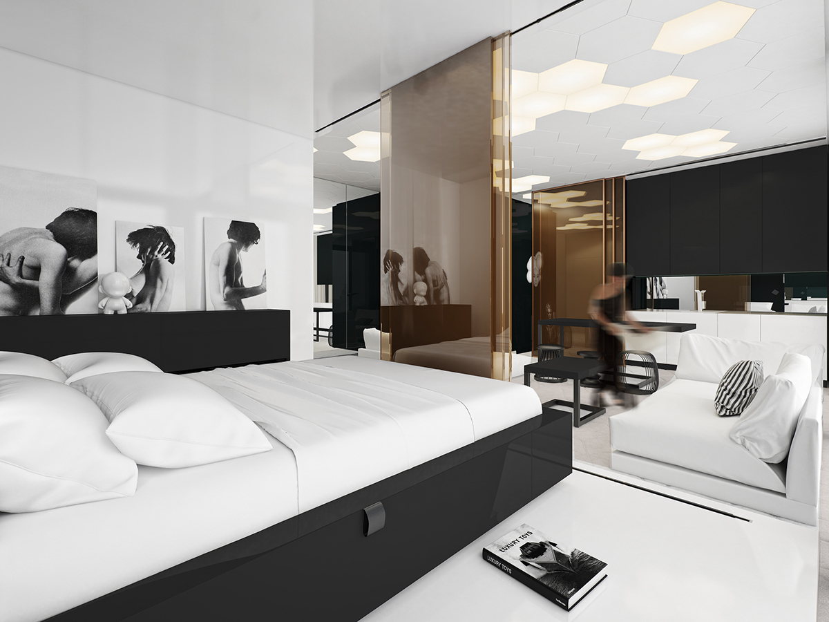 The bedroom is separated from the living room by a lattice partition that allows light to pass into the depths of the room.