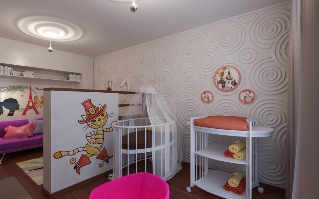 Part of the hall, which acts as a bedroom, can be fenced with built-in wardrobes with mirrors or racks with multiple shelves facing the children's area. They will house books and toys, stationery and other small items.