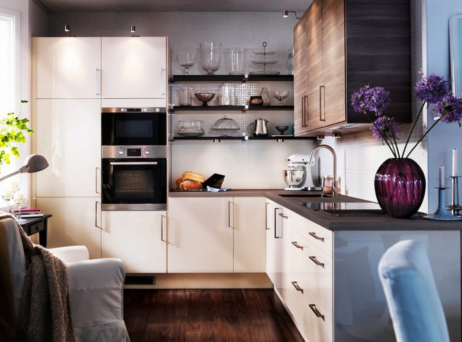 When choosing furniture for a studio apartment, it is recommended to determine the size of the equipped space. Moreover, it is important to know them not only with the layout of the floor, but also vertically. It is much more convenient when the kitchen unit occupies the entire wall to the ceiling to hide as much as possible behind the doors: