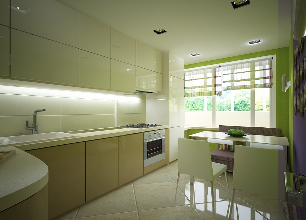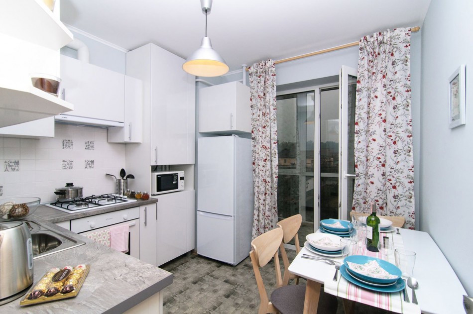 Choose a kitchen set so that it fits only along one wall. Then, on the opposite side, the window will have room for a soft kitchenette and a narrow roomy refrigerator.