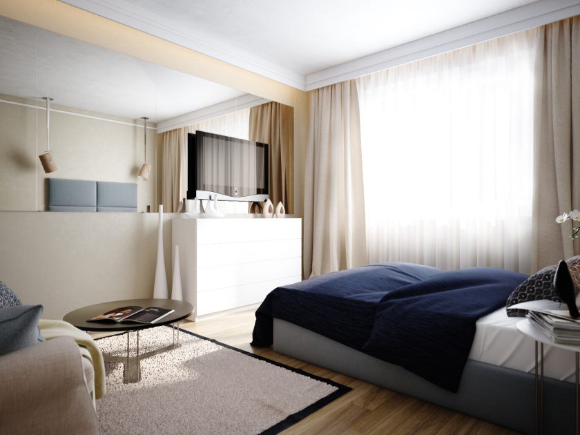 In such a room as a studio apartment with an interior in the “odnushka” it is convenient to retire with headphones to a laptop, TV or smartphone - do not interfere with the rest of others. At the same time, it is not difficult to simultaneously watch a child sitting at a computer or elderly parents engaged in watching television in the opposite corner.
