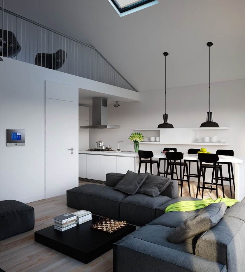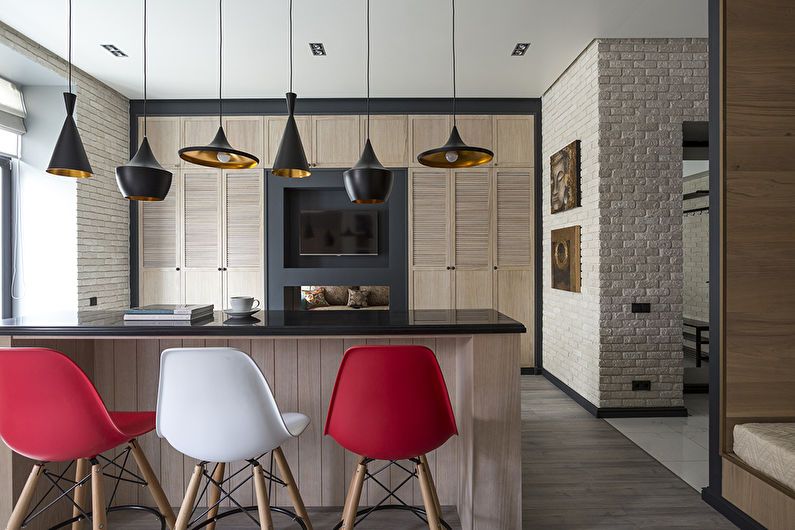 Open-plan options (with the dismantling of the partition between the room and the kitchen) have their advantages and disadvantages. Although the usable area and free space are as if more, but all the smells of sounds from cooking fill the adjacent rooms. In a common space, it is important to have a powerful and almost silent hood to block odors and burning.