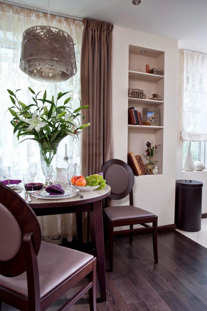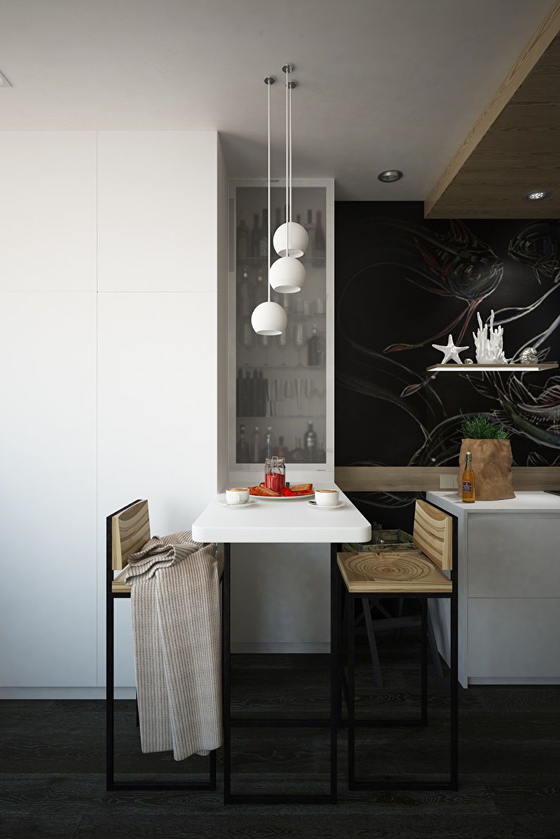 The dining area can be organized in the free space of the kitchen or taken out into the living room. The most rational option is to expand the window sill to the size of the countertop and use stackable stools that slide down under the makeshift table with a slide.