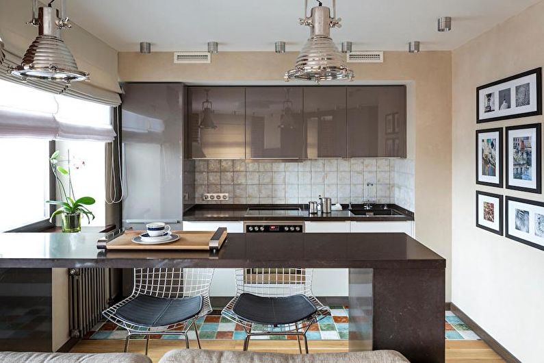 The kitchen interior in a small space should be stylish and concise - as few cabinets and cabinets as possible, but where each horizontal plane is useful. At the same time, it is important to manage every corner and wall as reasonably as possible in order to leave more space in the aisles. The upper third of the walls is usually empty - fill with light open shelves for dishes.