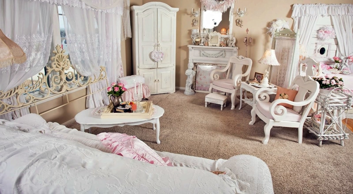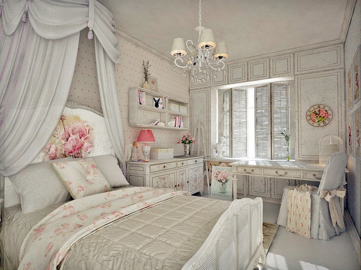 The main interior design in the style of shabby is a rose. It should be present in such interior elements as textiles, wall patterns, stucco molding, art paintings.