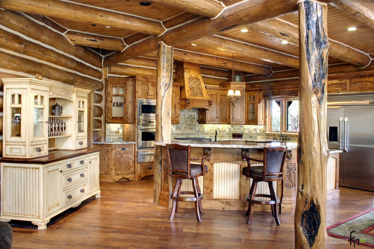 There are no strict rules in the design: all types of coatings are welcome, but varnishing is rare. Round saw cuts and massive countertops are used.