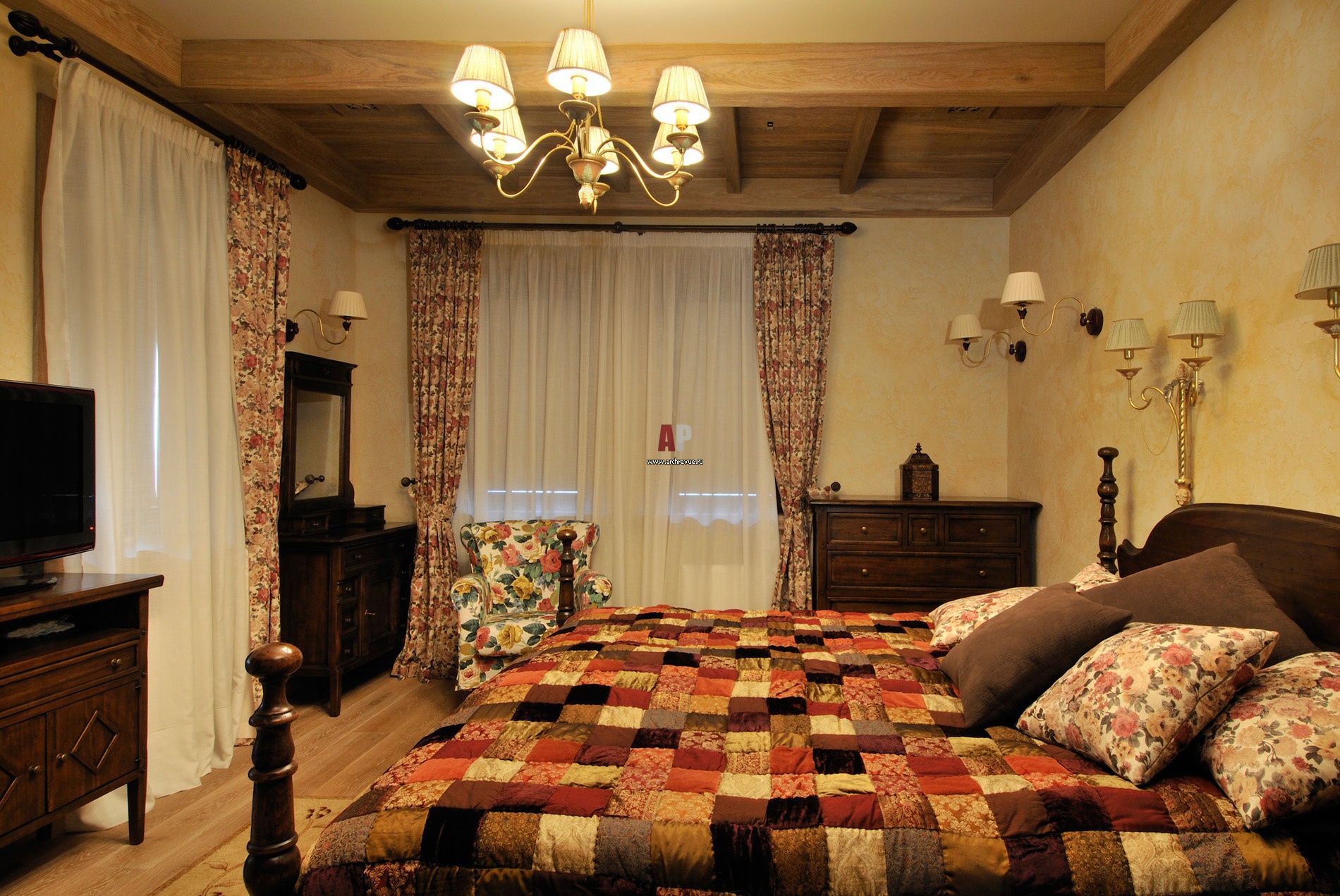 In the bedroom, install massive, but low beds, carefully sanded or varnished furniture. Day curtains will contrast with the weight of linen at night, bed linen with floral patterns can be covered with a blanket stylized as a tapestry depicting a still life, landscape or animal paintings.