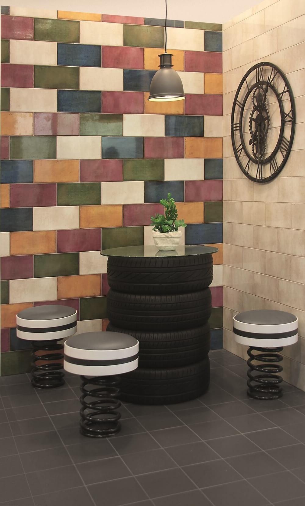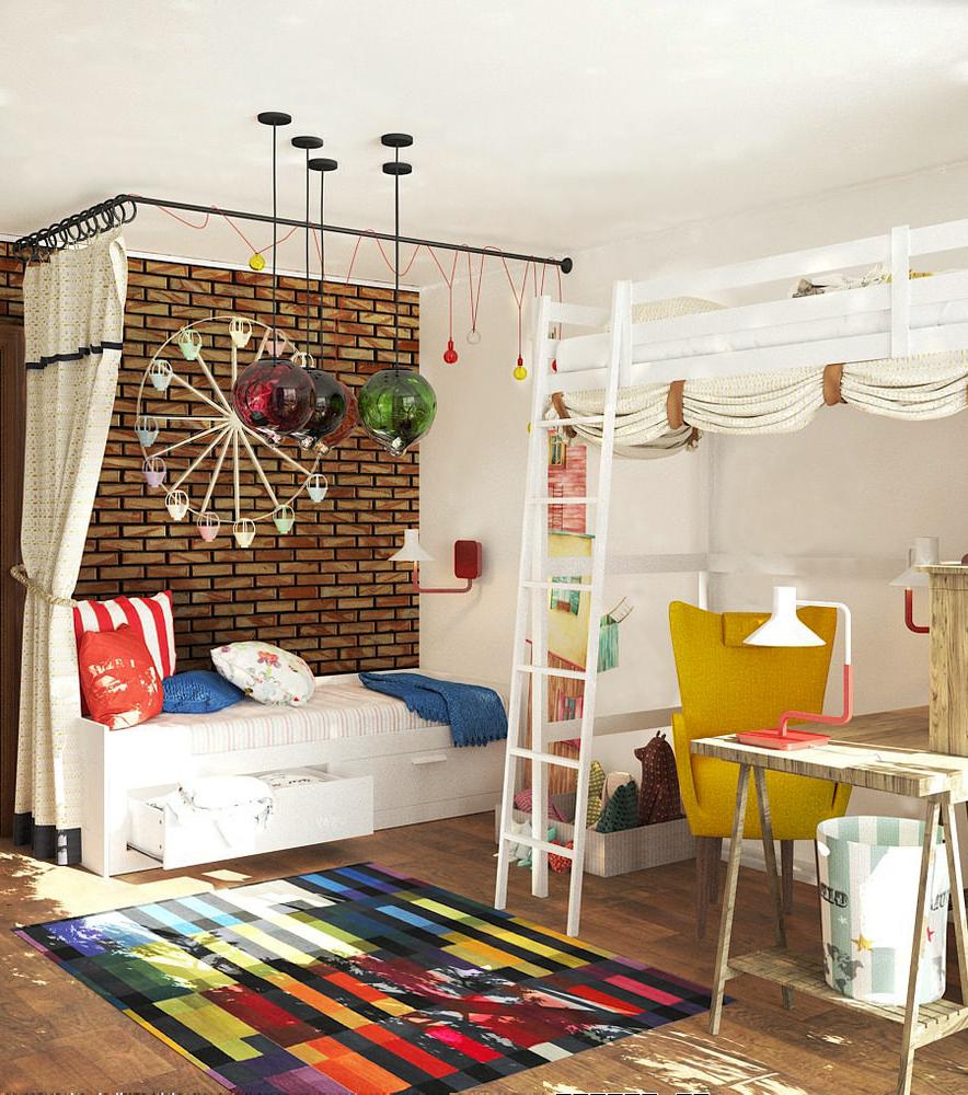 All the colors of the rainbow were mixed here, and posters with bright drawings were used to decorate the ceiling.