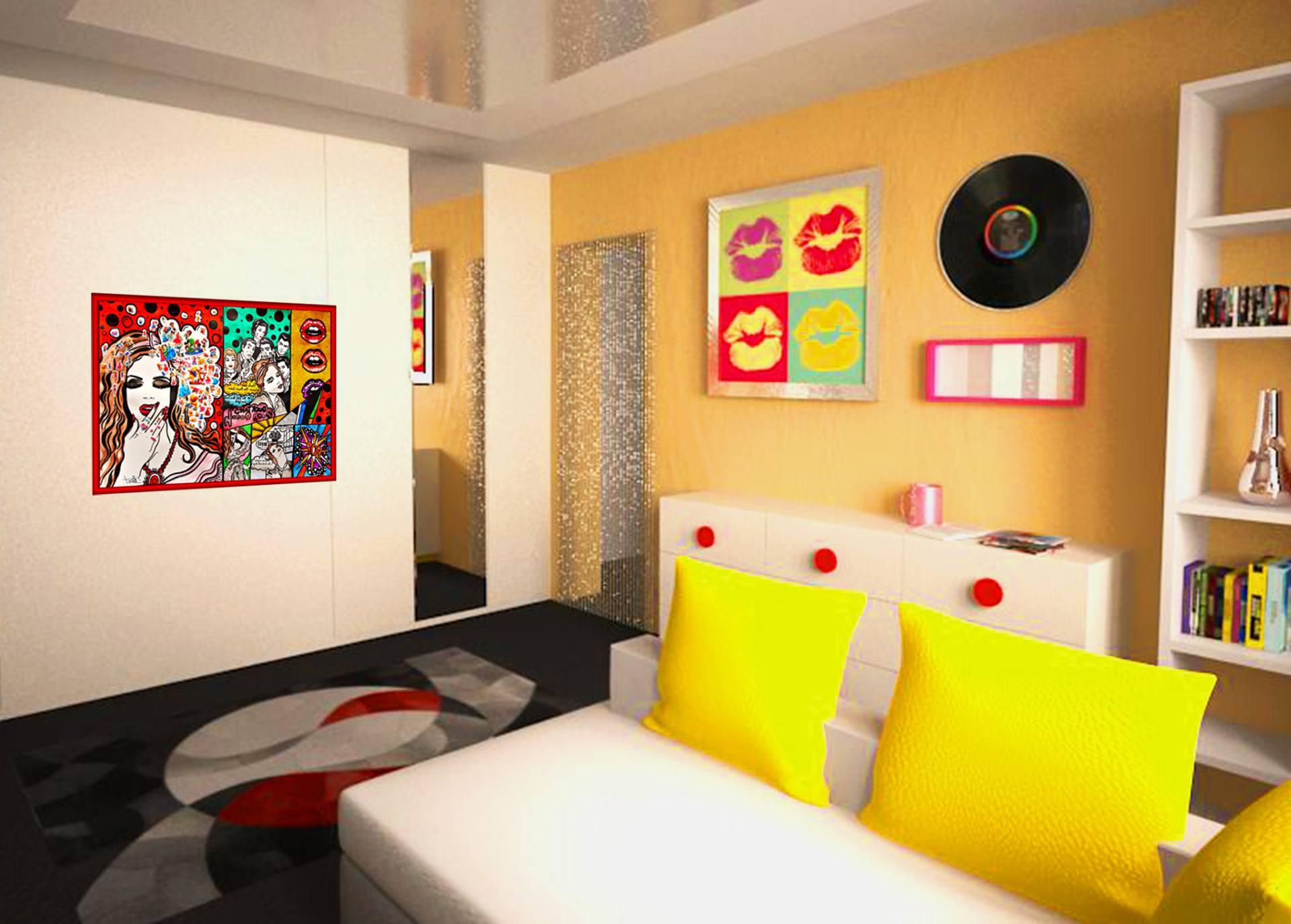 Bedroom with a “flashy” coloring of walls and ceiling in the style of kitsch for people who just need to break all conceivable rules