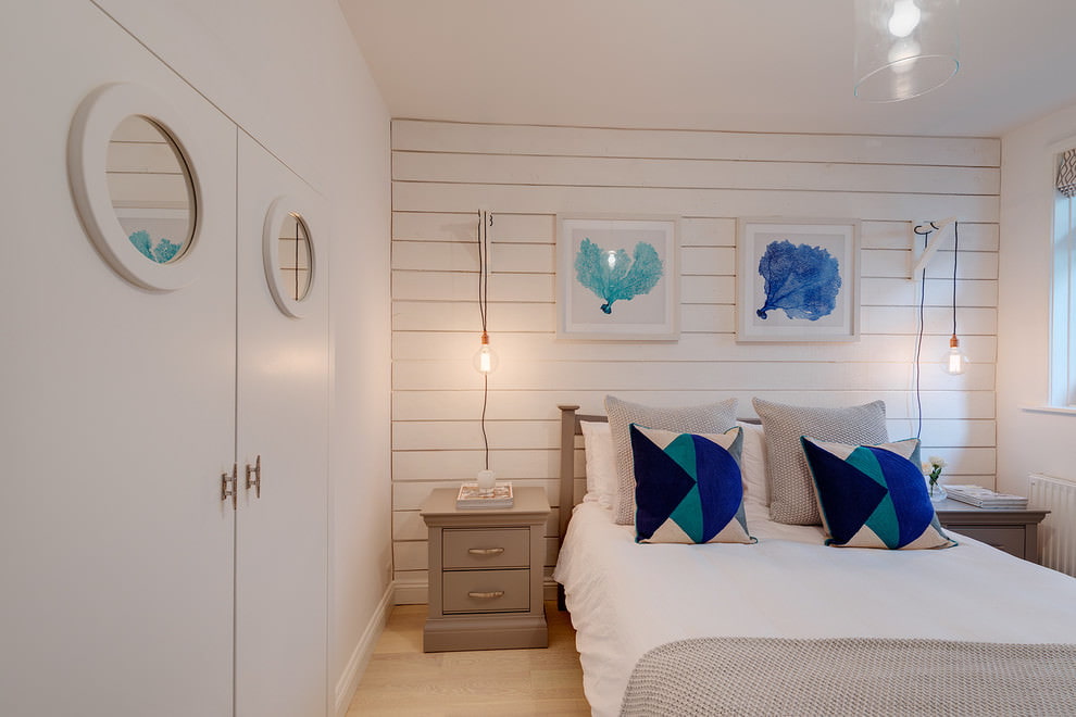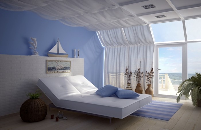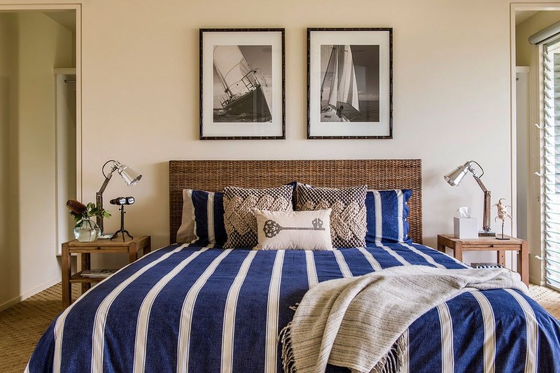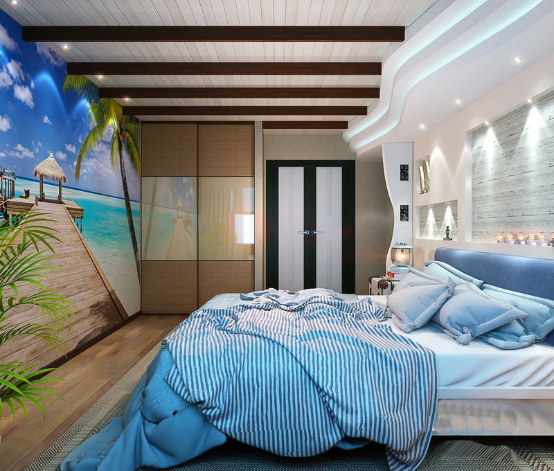 When designing a living room in a marine style, simple little things brought from vacation are extremely useful: shells of mollusks, stones of unusual colors and shapes. They can decorate wooden shelves on the walls. When creating a bedroom in a marine style, tricks that are relevant for the living room are used. The only caveat - in the bedroom you should not clutter up the bed with many pillows, it is enough to pick up bed linen in a white, cornflower blue or blue-blue color palette.