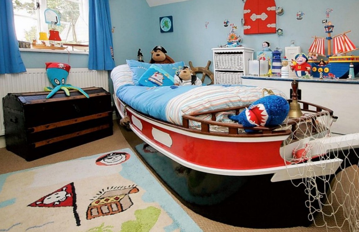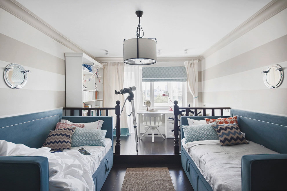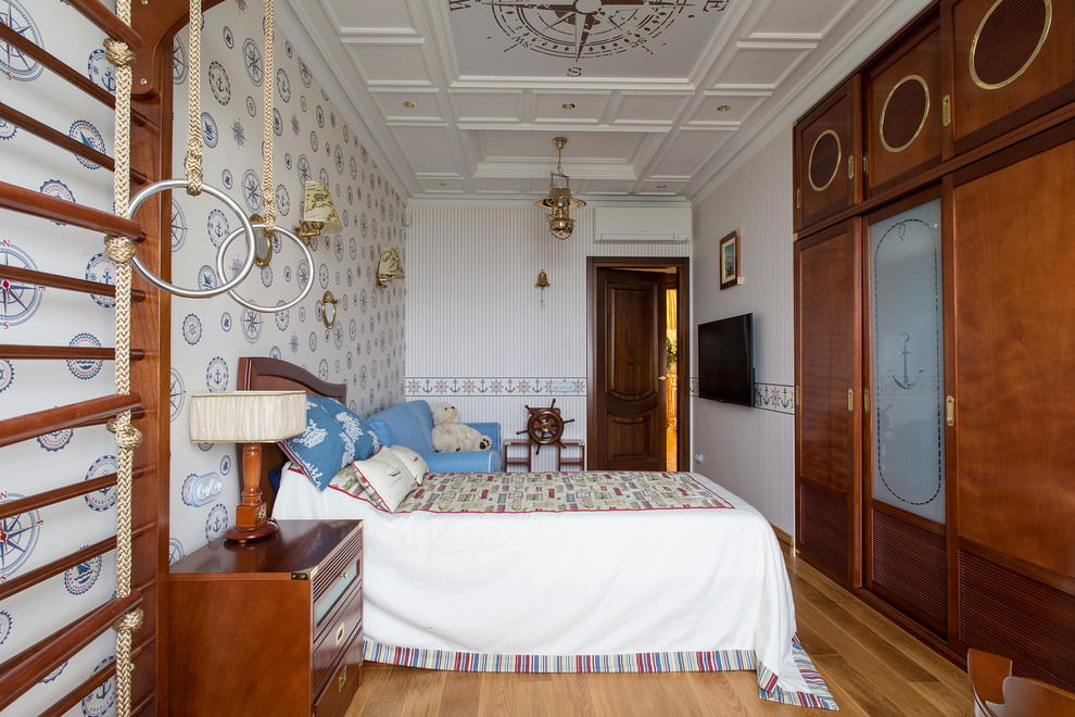 In children, the sea is associated with fabulousness, adventure and carelessness, so the creation of a nursery in a marine style is quite common. The most interesting thing will look like a room in the form of a cabin, in which there is a bunk bed, a hammock (if the area allows), ropes and a lot of thematic attributes.