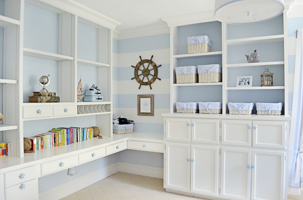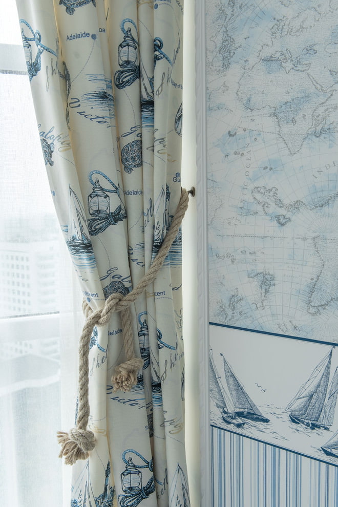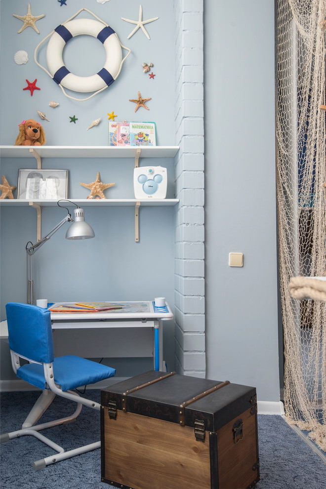 To give the atmosphere more realism, it is worth sticking on the walls photowall-paper with the image of the sunny coast. A carpet of blue or ultramarine color on the floor will look stylish and relevant for this style.But if the child is under 3 years old, then it is likely that you will have to clean the coating every week. In this case, a rug with a high pile is better.