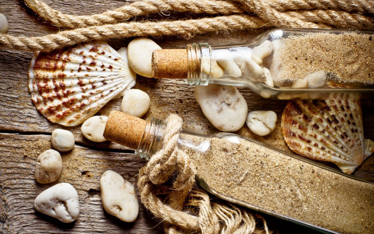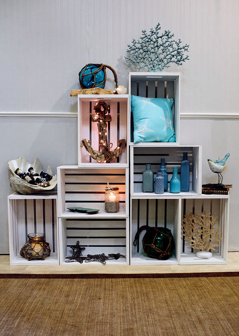 Candlesticks in a marine style will also look original, where paraffin will be poured into an empty flat shell. To make the atmosphere as comfortable as possible, you can make a wooden house with shelves that will accommodate cute baubles. With your own hands you can even create furniture in a marine style, for example - a coffee table. Only for this will fit a table with a glass top, under which you can lay out the nautical attributes.