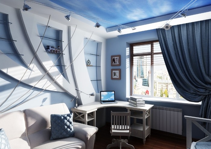White, blue and blue are the main colors that are used to create a marine interior, but for completeness, they are diluted with beige, brown, and sometimes red. Often, blue is replaced with a sky color, and blue with an indigo or ultramarine tone, which looks stylish and modern.