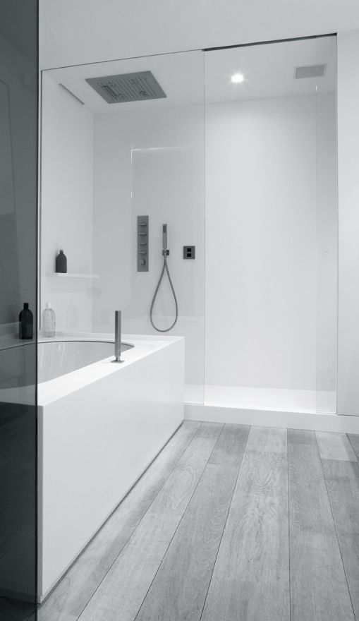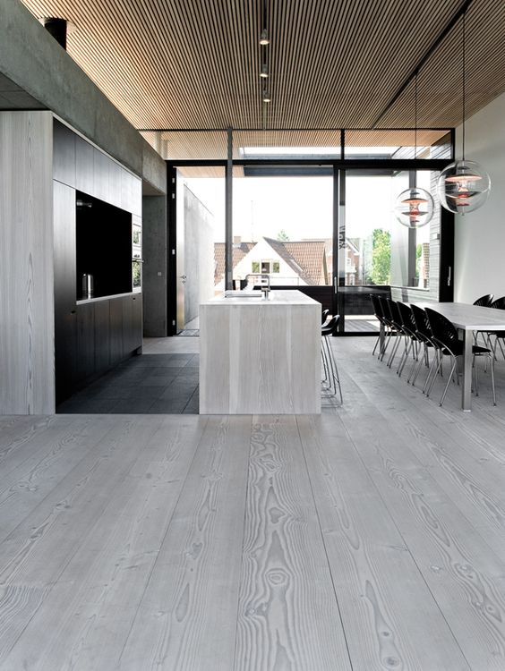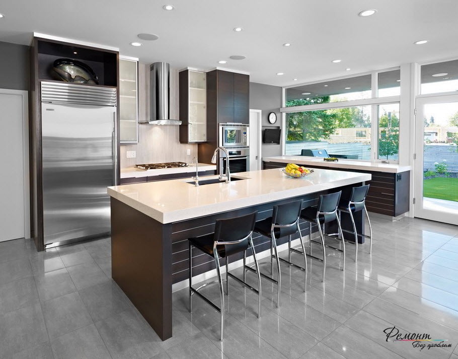 The gray flooring in modern interiors easily coexists with glass, white gloss, sparkling and brushed metal.