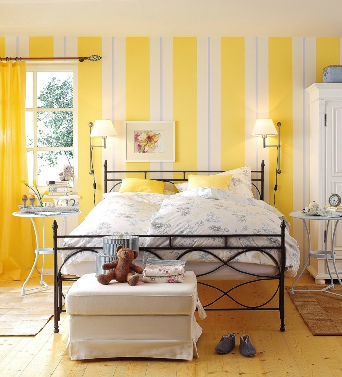 Interested in what juicy yellow color is combined in the interior of a classic bedroom? Here the combination of white, black, brown and yellow is most harmonious, especially against the calm background of beige walls.