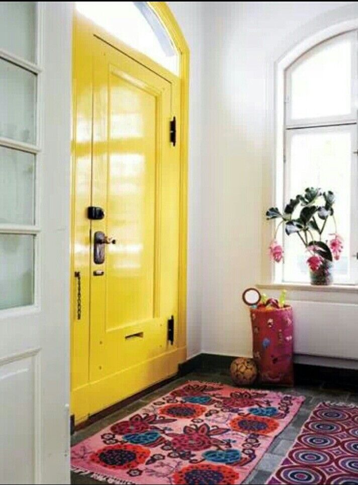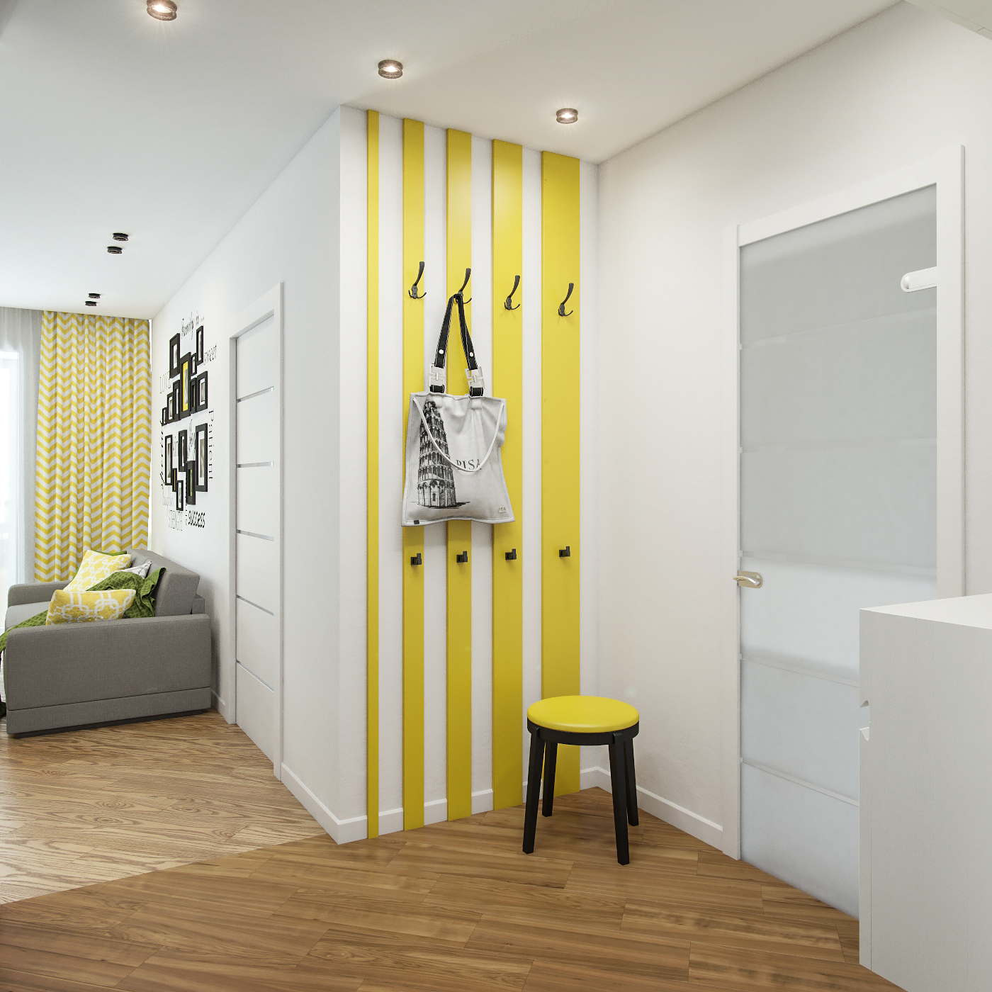 - Hallway Many are interested in what shades are appropriate in the interior and with what color the yellow color at the front door is combined. Here the amber trio is in harmony with beige and dark green. If you replace dark green with brown or black, then you need to correctly select the shade of wood (laminate on the floor and eco-veneer for interior doors).
