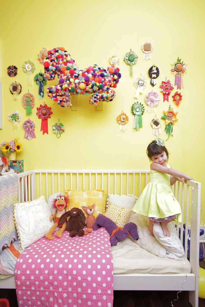 - Bright yellow tones are suitable for a children's room - preschoolers love a radiant color. But it should not be in excess, choose one thing, for example, banana-colored furniture, curtains or a door, complementing with accessories and soft toys. Add the theme of the sun, dandelions or sunflowers - the room will immediately transform.
