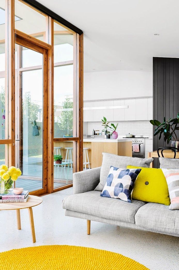 Three well-chosen accents - a yellow door, a red pillow and a blue pouf
