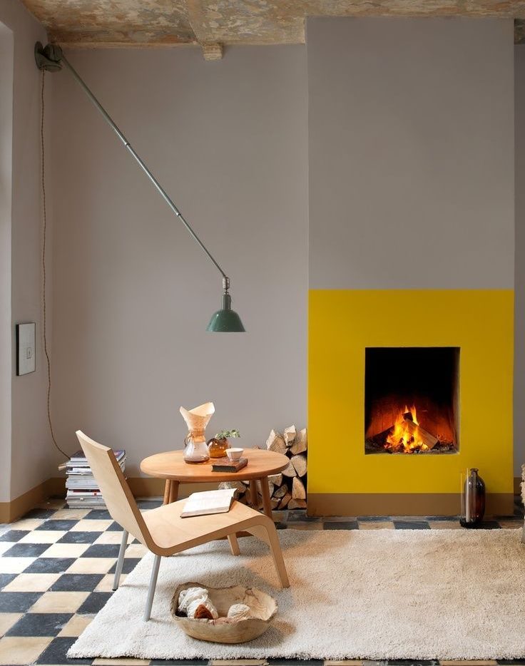 Beautiful combination of a yellow armchair with gray walls and black decorations