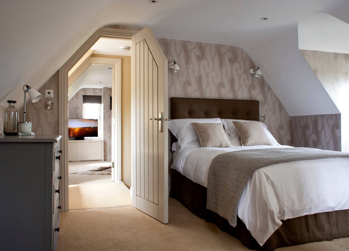 The first thing that matters is form premises. It usually has a beveled low ceiling. This determines the choice of furniture, lamps and scenery.