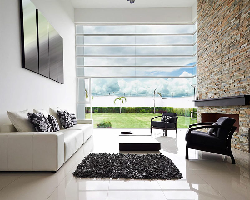 - A large amount of light in the room, both artificial and natural (for windows they use simple solutions: single-layer curtains, fabric blinds or do not decorate). They design houses with a large number of windows, with panoramic and dormer-windows, in apartments, if possible, expand window openings.