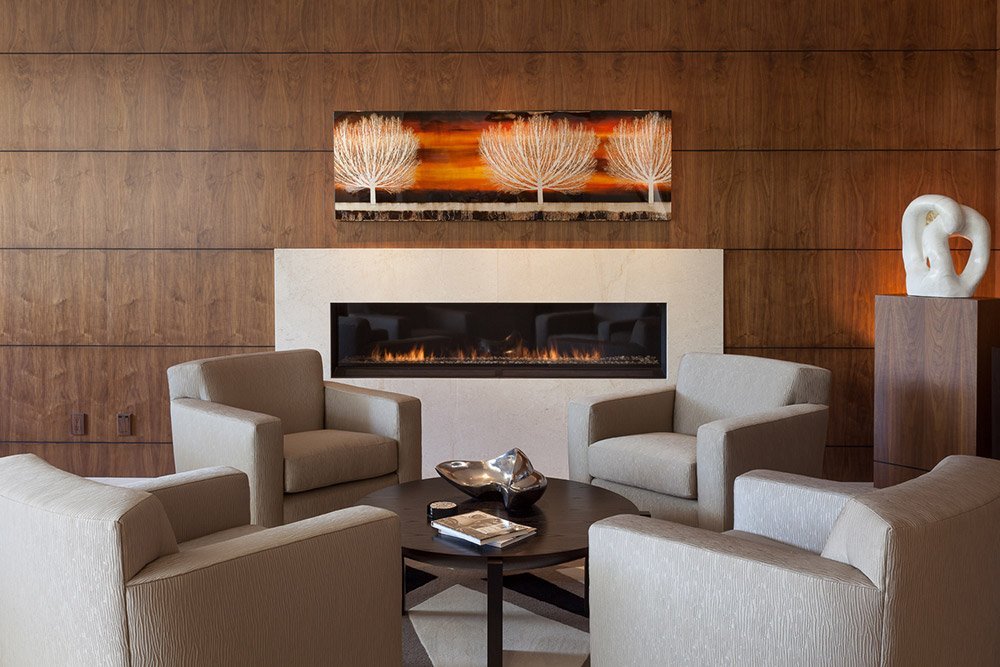- combination of textures (stone, painting, wallpaper, stone and wood inserts).