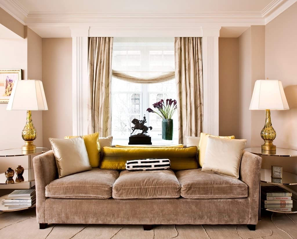 Upholstered furniture is often selected in the shades of the background, soft and unobtrusive, but it is possible to make the sofa a bright accent (emerald, marsalum, yellow or blue).