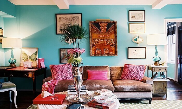 Here you can paint the wall completely in one of the elements of the main gamut. A darker and calmer tone is best, since an abundance of bright and rich notes can tire, cause discomfort and even aggression. In general, for the living room, this color will bring a positive mood and freshness.