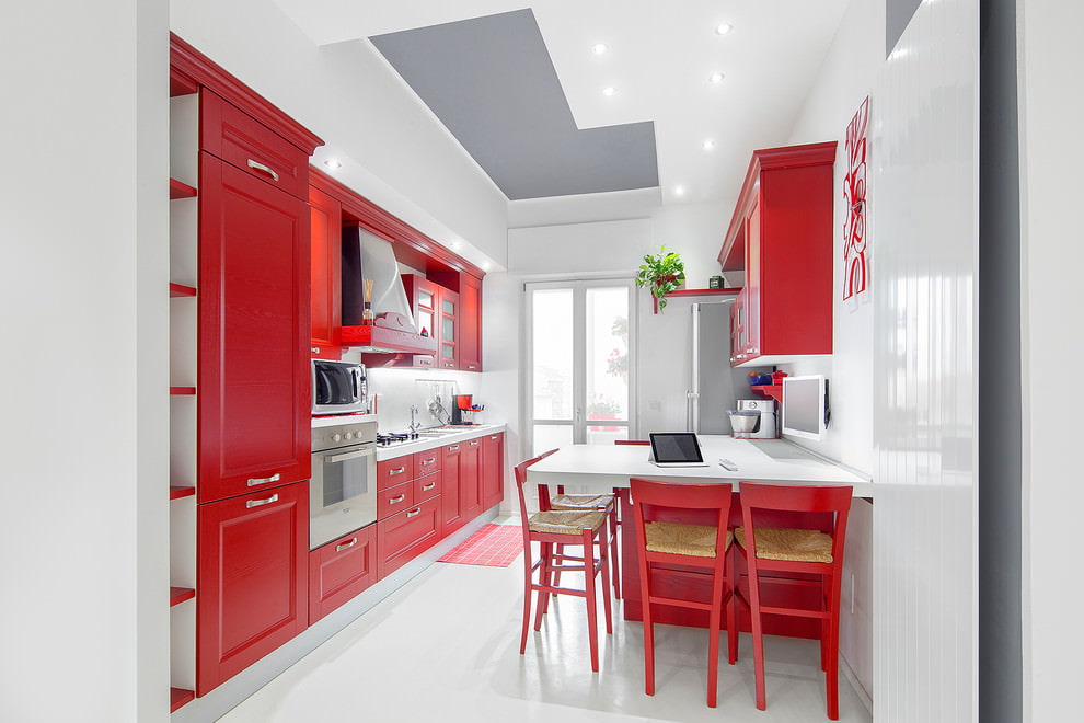These scarlet chairs fit perfectly into the white facades of the kitchen