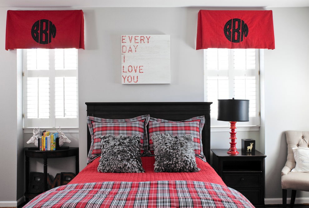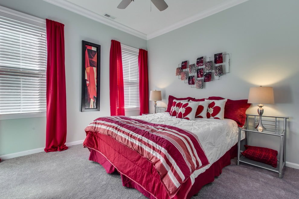 Textiles are the most favorable area for implementation. In the bedroom, color is realized in curtains, upholstery and bedding. This is a great option. Scarlet curtains will add freshness and spaciousness, if you choose darker - comfort.