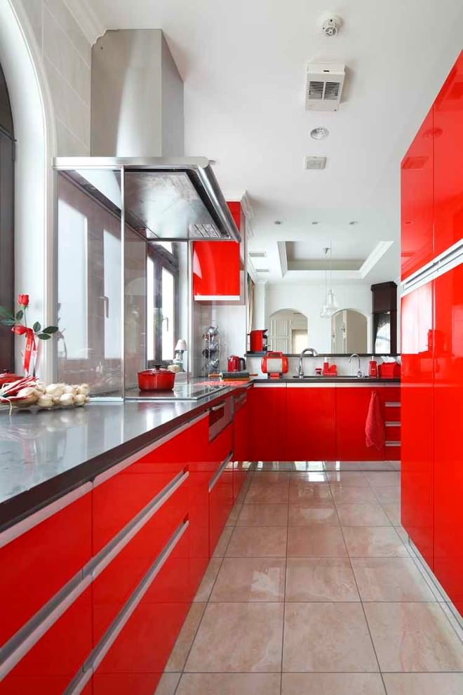 For flooring, wood and tile are used. With both options, it is possible to create a red interior. Only in the first case it will be darker, especially if you use natural wood. In the second case, you have a wide selection of colors. The most popular was ceramic tile. Choosing this option, you can independently choose any color. It is worth noting that granite and marble are somewhat limited in this regard, as these are natural minerals with their own unique color.
