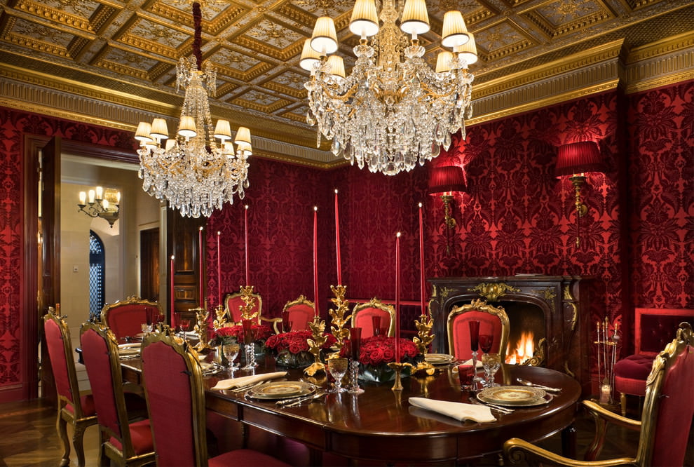 In the classic interior, red is combined with olive, golden and emerald colors.
