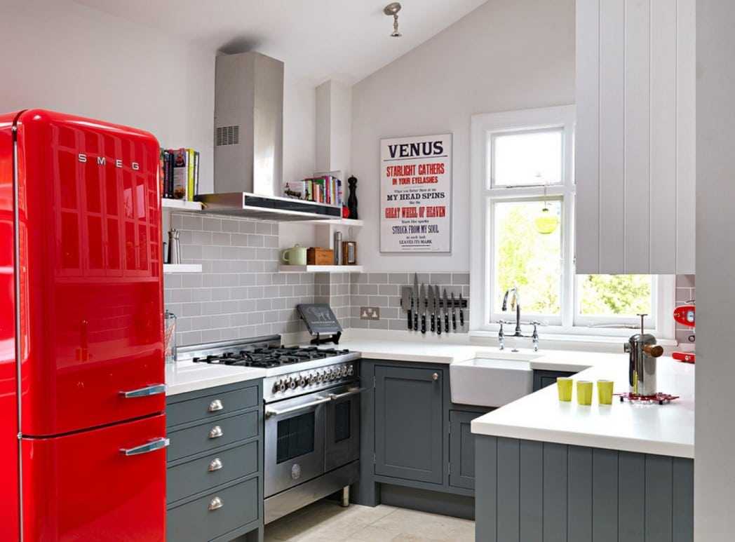 Red color in the interior of a white kitchen