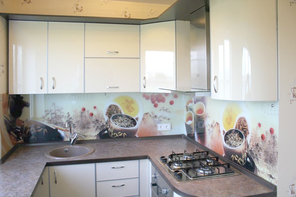 Plastic, metal, glass - the basis of the headset. Smooth glossy facades look neat and stylish. Gloss and glass elements visually expand the kitchen without overloading the interior. Cabinets with glass wings or open shelves look much lighter than their counterparts with blind facades.