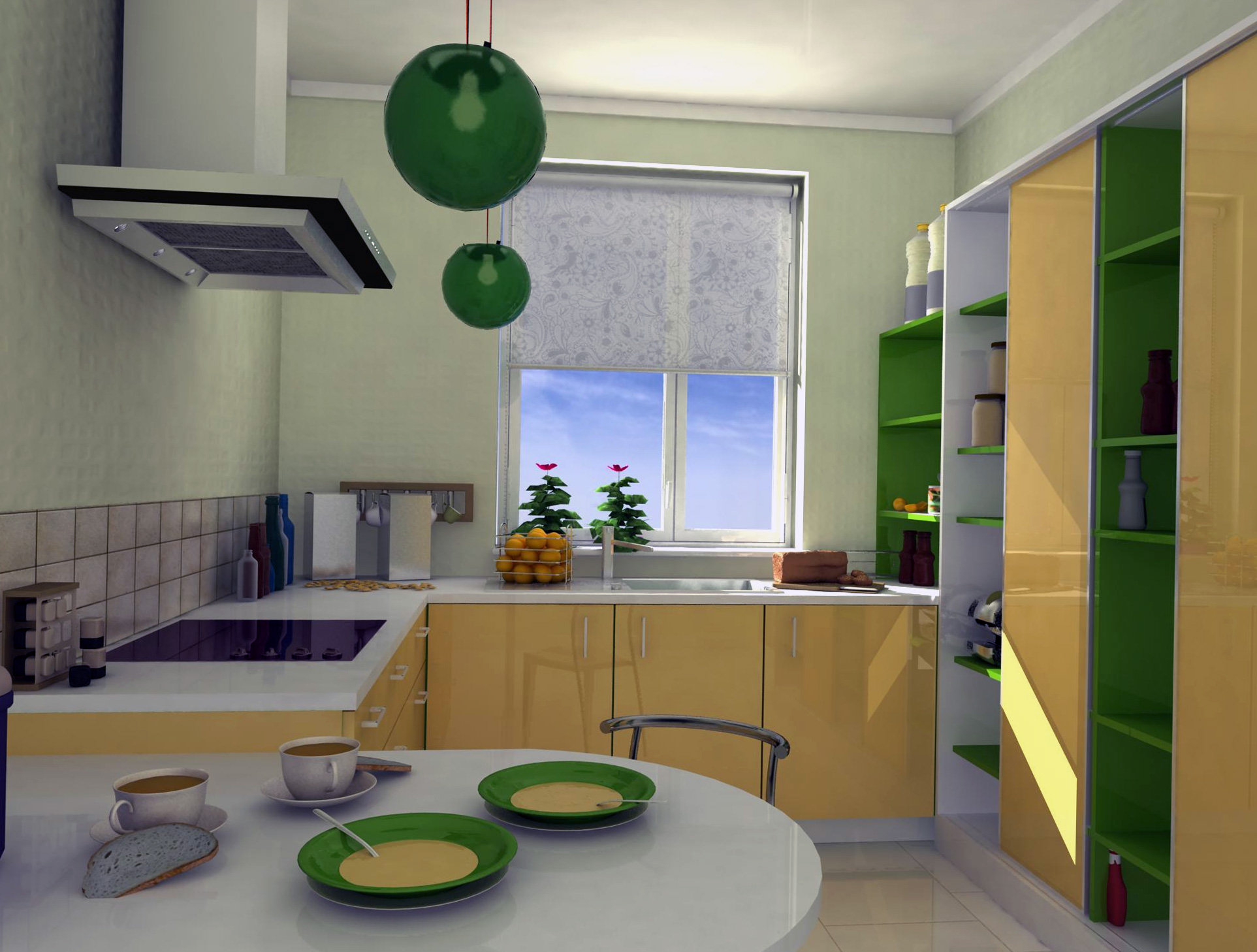 - Green. Herbal, emerald, lime - it does not matter, any tone of this color will add brightness and life to the design of the kitchen. It can be an accent wall, a soft sofa in the dining area, an apron, textiles, photo frames, etc. Living plants are, after all, the easiest way to add green.