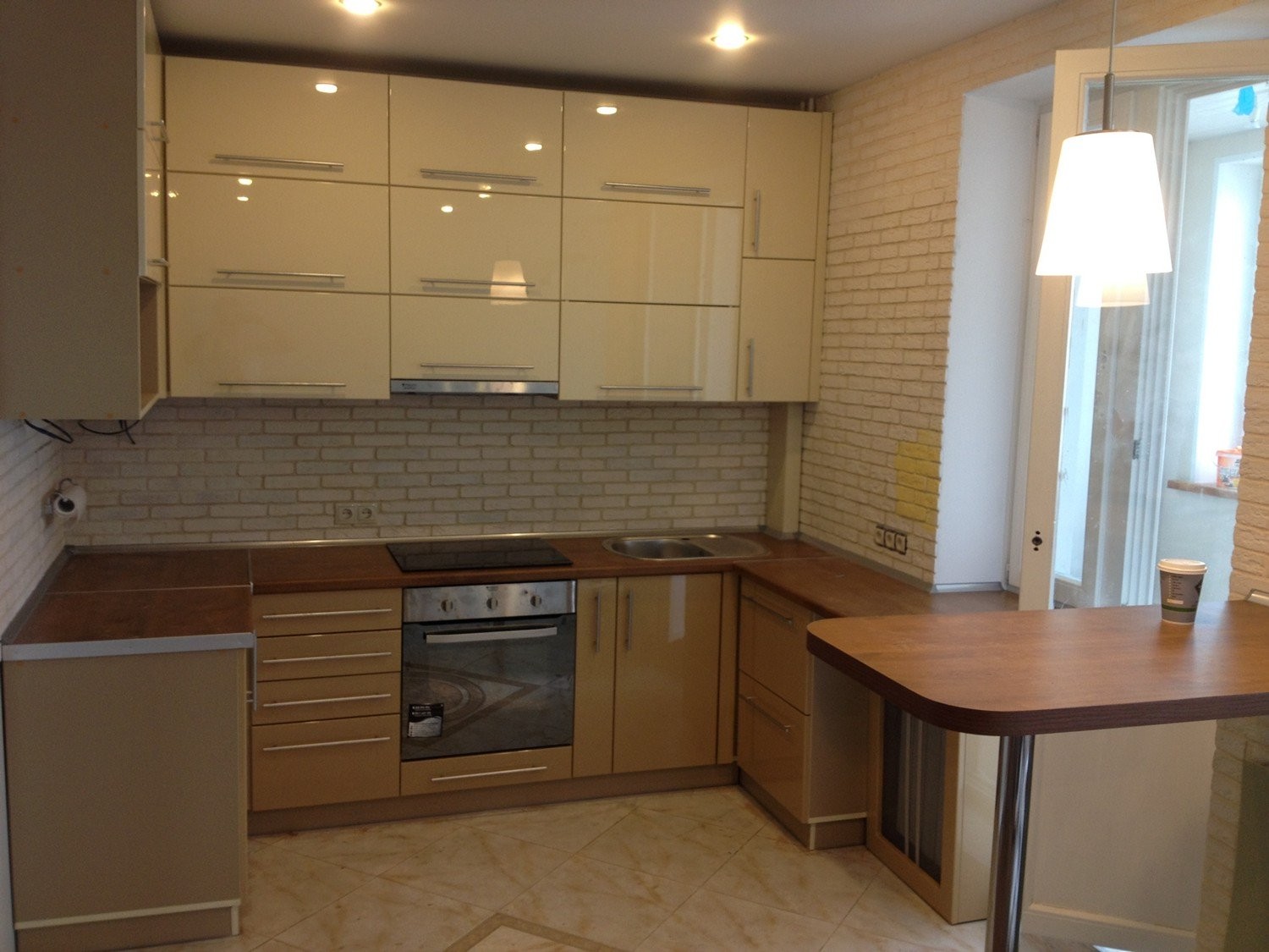 - LEDs and fluorescent lamps are perfectly combined with the beige interior of the kitchen, in addition, they can save on electricity.