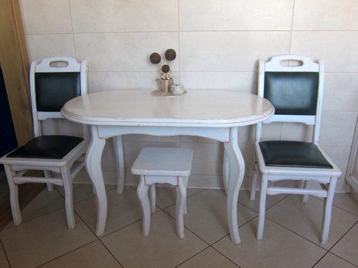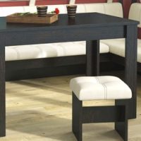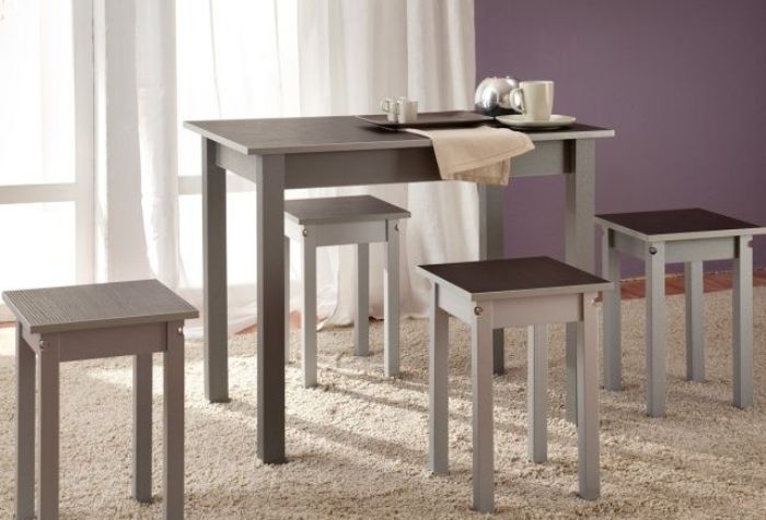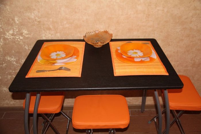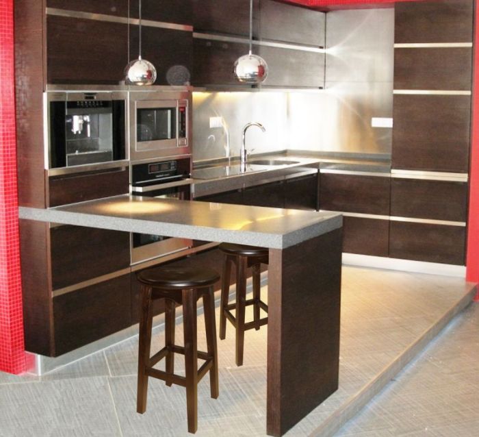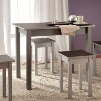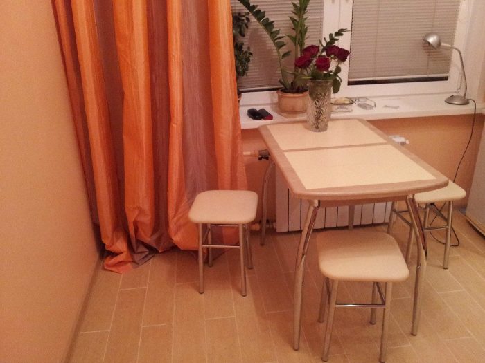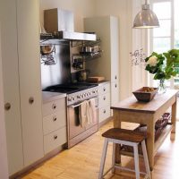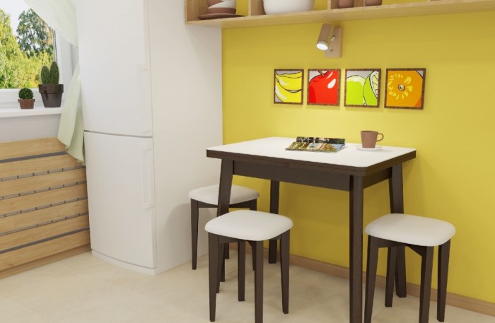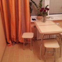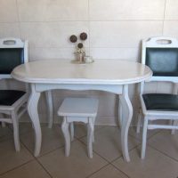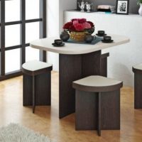 An indispensable attribute for a very small kitchen. Differ in high legs with a support for legs. A high table and chairs complement the modern interior.