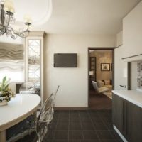 The place of eating consists of a table with chairs or a small sofa, which is built into the ledge, placed near a free wall. You can highlight the space with a podium, a screen, a bar counter. The room is illuminated with a ceiling chandelier on a long lace, several sconces.