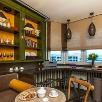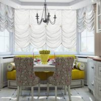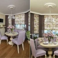 The set is made light, usually wooden, it is preferable to place the dining area near the bay window, having decorated it with rattan wicker furniture. Also, short floral curtains, other draperies with such a print are suitable.