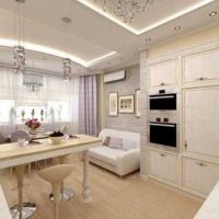- L-shaped layout - captures a corner located closer to the door, the dining area is located on the opposite wall or in the ledge, a sideboard or a TV on the console takes up free space.
