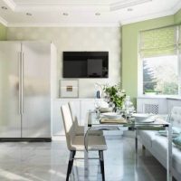 The modernist interior is characterized by smooth lines of the headset and other furniture. There are many glossy surfaces made of lacquered wood, MDF, chipboard. It is better to decorate the walls with murals, and make a kitchen apron out of plastic.