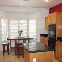 Kitchen interior with bay window in the dining area.