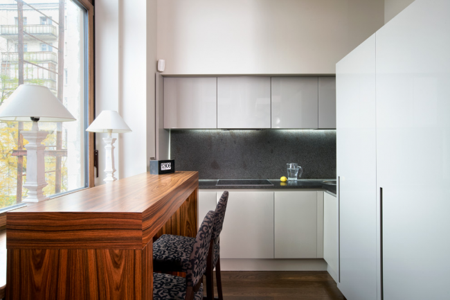 Create a cozy atmosphere and properly highlight work surfaces can halogen lights. Especially if light rays are reflected from mirrors and glossy surfaces of furniture.