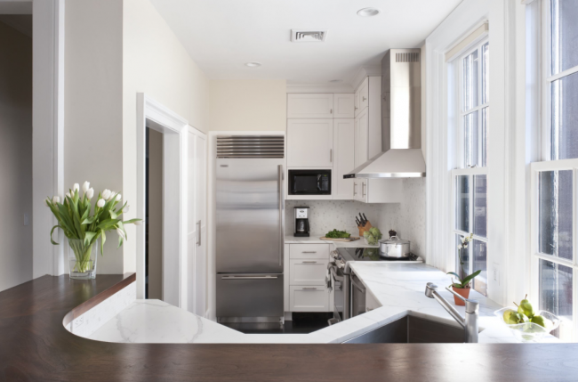 The main advantage of such a layout is a refrigerator hidden in a cabinet.