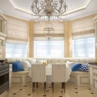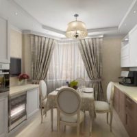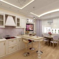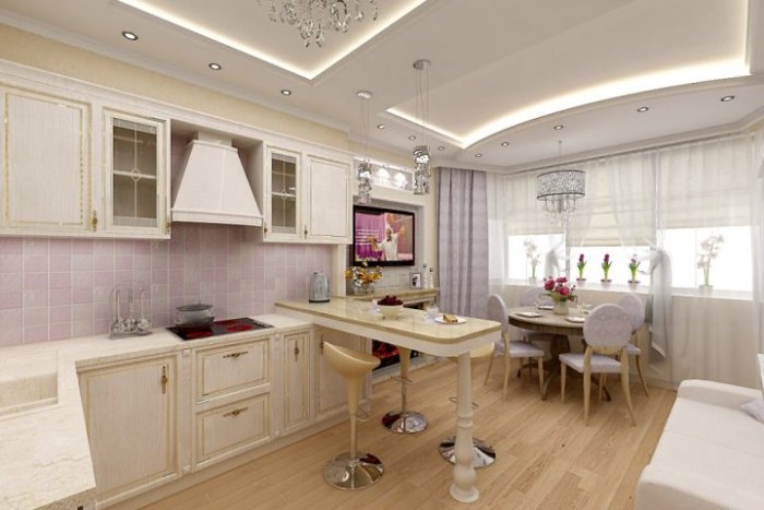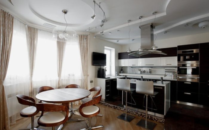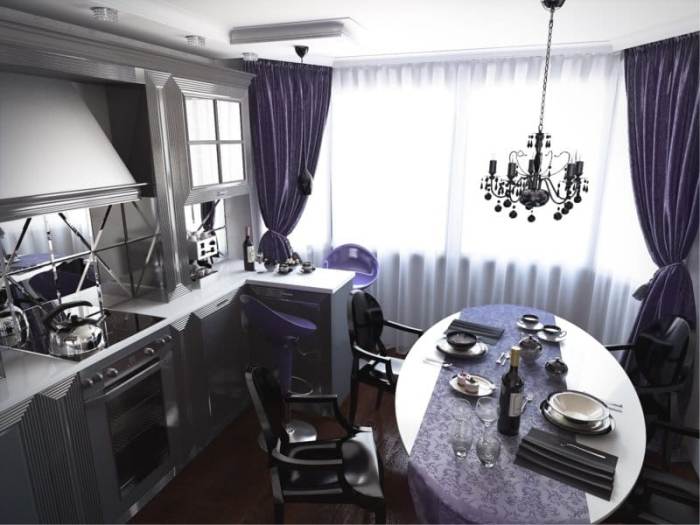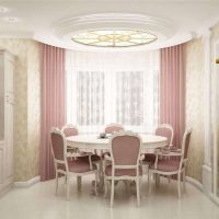 Experts do not recommend cluttering a bay window with high furniture such as shelving, any cabinets, hanging shelves. One of the most important moments when planning a kitchen is to maintain the integrity of the space, but at the same time to carefully zon the room. It is separated from the rest of the room by a thin curtain or a folding screen, a step or false columns, a bar counter or a pair of plants in flowerpots placed so that it is not too easy to touch and knock over.At the same time, the entire kitchen is decorated in a single style - classic, oriental, Provence, loft, high-tech, art deco, any other.